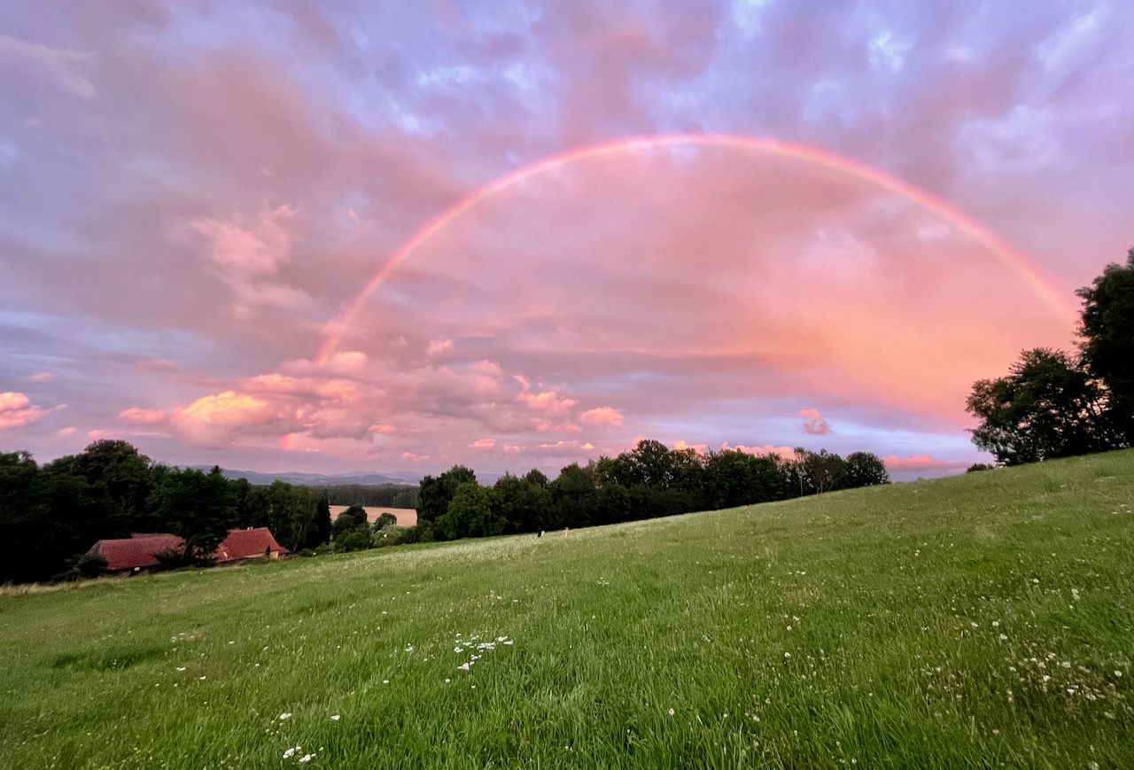 - už máme trvalý bydliště v Bujanově. Odměnou nám byla duha, přímo nad domečkem. Jako uvítání dobrý. Smutný mi jen přijde, že když se člověk takhle nastěhuje a přihlásí, že nedostane nějakou hezkou nalívárnu, třeba i jen to: přijďte příští týden na traktoriádu - bujanovskou velkou slávu - rádi vás uvidíme. Já vím, že jsme ti noví a náplava a tak, ale stejně. A tak si pořád hraju s myšlenkou, jestli by třeba nešlo vymyslet něco, co by ty první kroky náplavám do novejch míst zpříjemnilo.