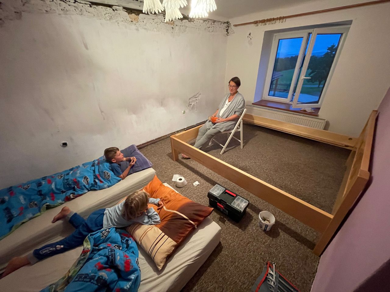 - žijem teď trochu v krabicích a pytlích. Ale už máme postele, a pračku a ledničku. A tenhle týden to všechno pofackujem a zprovozníme vevnitř, ať pak můžem s klidem ven. Hezký je na tom to kutění. Vymyslet, jak si v místě, kde není zavedný plyn, udělat plynový sporák. A jak si radši koupit hasicí přístroj. A jak splašit trámy na dřevník zadarmo nebo za pár šupů. Jak využít domrtě materiál, který jsme podědili. Jak stlouct prkýnka a udělat umyvadlo... baví mě to moc.