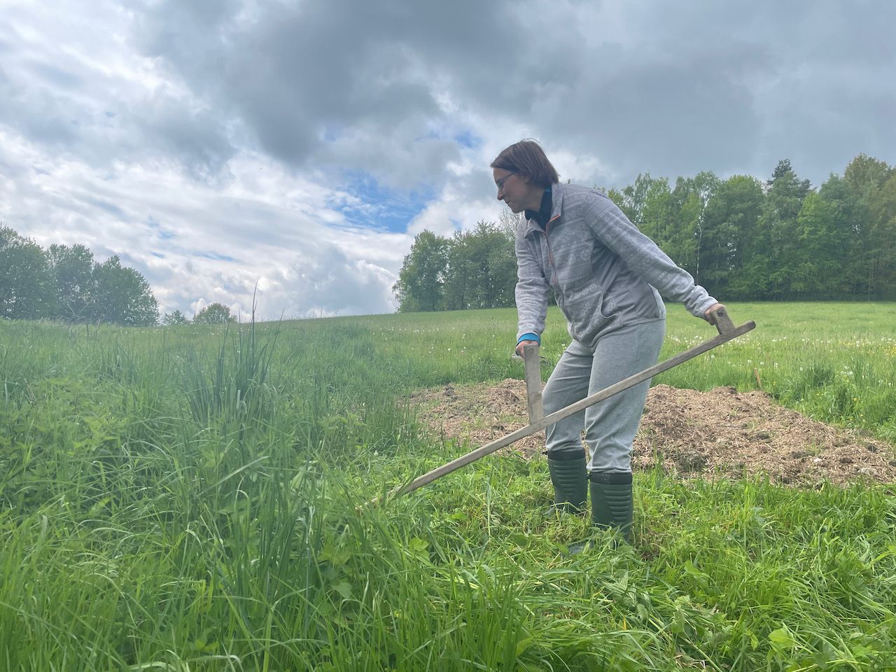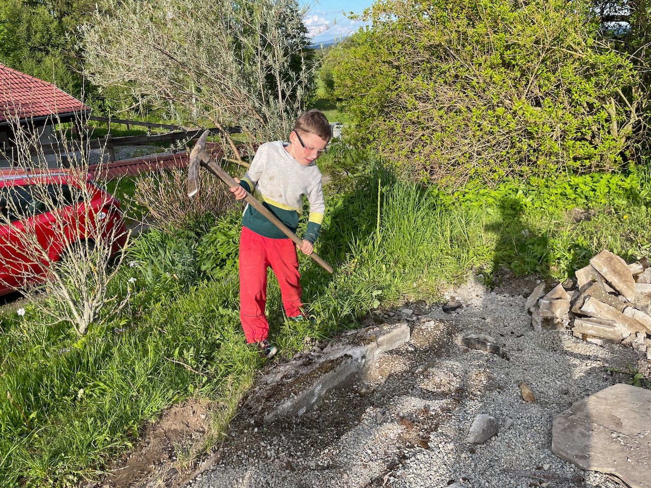 - Učíme se kosit. Máme sice krátký kosiště, ale velkej zápal a tak se nám povedlo posíct asi třetinu pozemku a travou zamulčovat budoucí políčka a stromky v sadu.