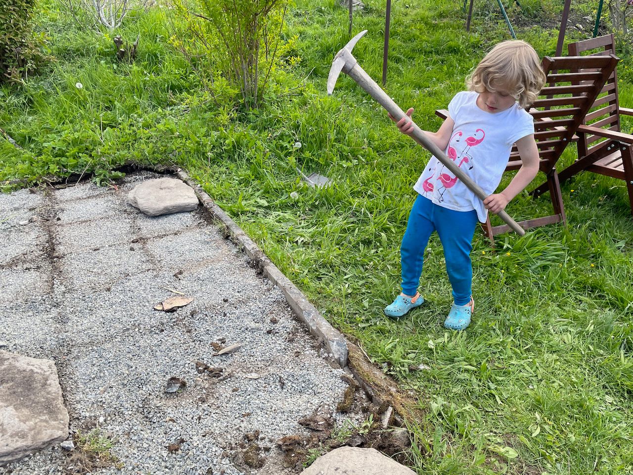 - Kluci se pustili s vervou do posledních zbytků betonových základů na pergolu, či co to bylo. Už jen párkrát bouchnem a bude fuč. A zbyde štěrk a na něj dáme placáky a velkej kamennej stůl. A kolem dřevěný špalky... Hezký to bude.