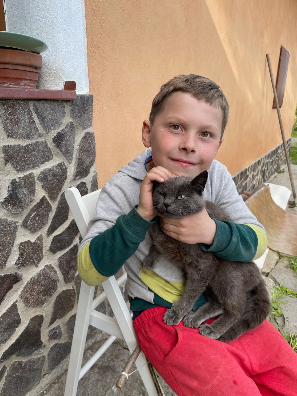 - Kiki sedí na klíně a přede. Terapie kočkou krásně funguje.