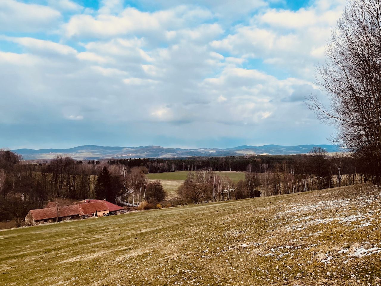 Když u nás vyběhnete na louku, vidíte malou chaloupku, polorozpadlou stodolu a Novohradky.