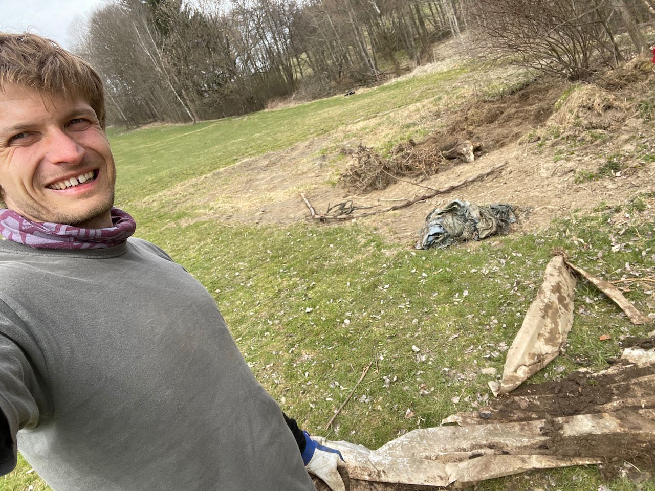 3. dubna: Jakože co si budem. Výhled z okna novýho doma je dost cajk.4. dubna: Když spolu s hektarovým pozemkem získáte taky ostatky po dřívějším hospodaření. Ostnatej drát, tunu letitýho igelitu, starý zarostlý lino, aby zahrádku nezarůstal plevel, pletivo prorostlý kopřivama, hafec plechu, flašky od piva, vína..., zbytky po starý technice na farmaření, cihly, tašky, šindele... Aneb ukliďme Česko u nás na zahrádce. Ps. Poslední dny myslím na kurz cirkulární ekonomiky, který jsem absolvoval minulý rok. Zvlášť na jednu přednášku Soni Jonášové, ve které blahořečila moudrost našich předků, kteří schovávali úplně všechno. Tak Soňo, ne vždycky je to moudrost. Občas to bylo prostě bordelářství.5. dubna: Nevěřil bych tomu, že roky cvičení s kettlebelly a běh na dlouhý tratě uplatním, když bude z drnů dolovat zarostlý brány a hliníkový plechy. Mám nápad na aktivistickej projekt do sudet. Jmenovat se to bude: laskavý konec skládek za humny. #zitpomalsi6. dubna: Vypadá to trochu jako mohyla, ale když do toho kopnete, najdete uvnitř... lino, péra z postele, zbytky sprejů. Celé je to zavezené hlínou a nejstarší bych datoval tak 40 let zpět. Nejnovější jsou stopro z loňského podzimu. Takovejch kupek jsme našli zatím 8. Některý těsně u potoka, kde kvetou blatouchy a kvákaj žáby. Projekt o laskavém konci skládek ta humny dostává jasnější obrysy. První část se bude jmenovat Hledání pokladů. #zitpomalsi
